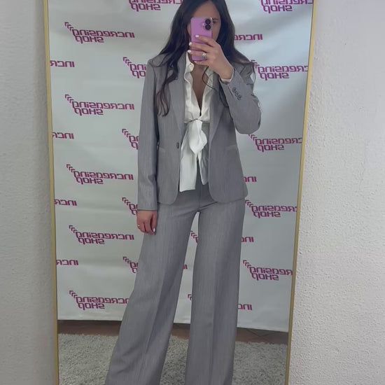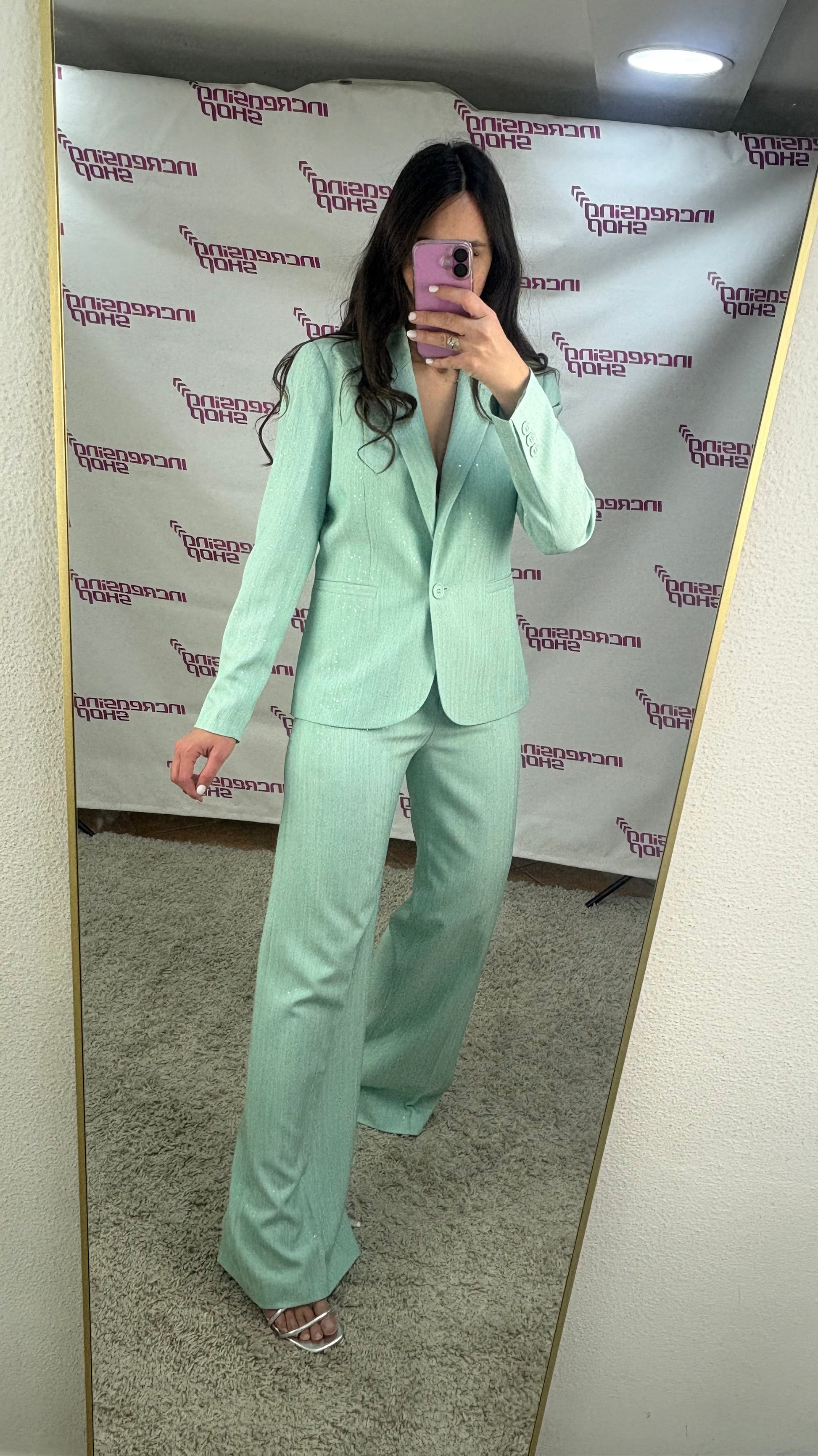 Questo incantevole tailleur con pantaloni palazzo è perfetto per chi vuole un look elegante ma vivace. Con i suoi brillanti glitter, questo tailleur aggiungerà un tocco di stile e glamour al tuo abbigliamento. Non solo, i pantaloni palazzo offrono anche comfort e libertà di movimento. Un must-have per ogni fashionista!